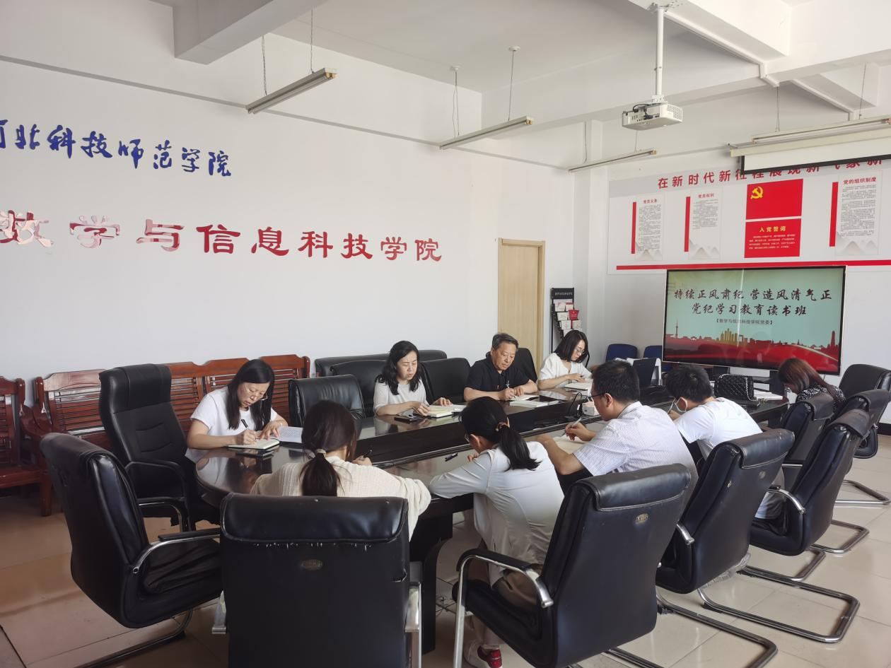 2024年6月20日-21日,数学与信息科技学院党委在学院会议室开展以“持续正风肃纪,营造风清气正”为主题的党纪学习教育读书班。全体党委委员、党支部书记、专职组织员参加了本次读书班。
