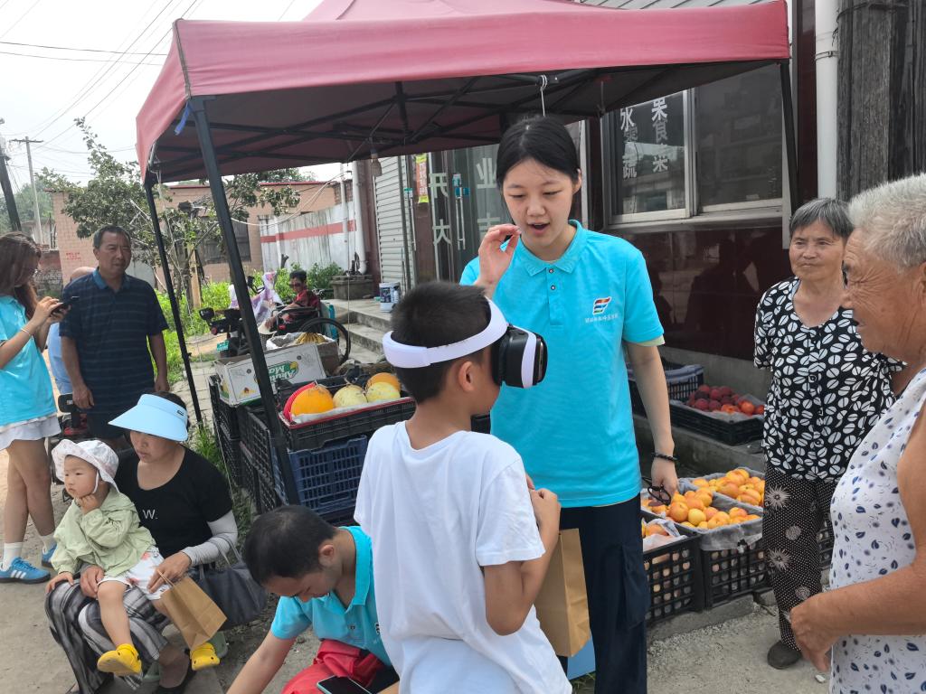 图为村里小学生体验VR眼镜