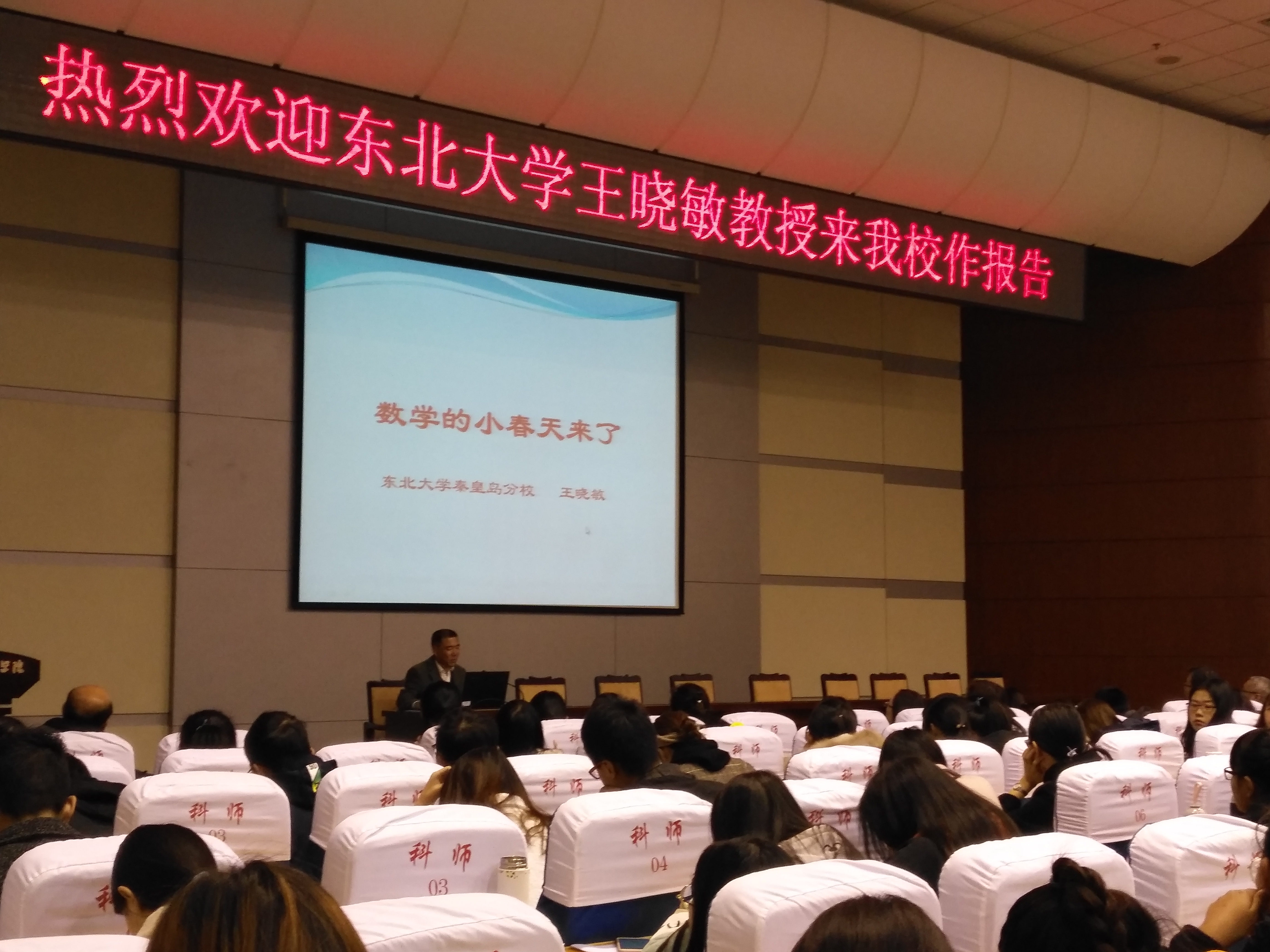 2018年10月30日上午,应beat365亚洲版官网的邀请,东北大学秦皇岛分校数学与统计学院王晓敏教授在学术报告厅作题为“从数学到人工智能--数学的小春天来了”的报告。报告会由beat365亚洲版官网行政负责人主持,学院全体数学教师及17级、18级应用统计学专业和数学与应用数学专业全体学生,以及计算机学科相关专业学生400余人聆听了报告。