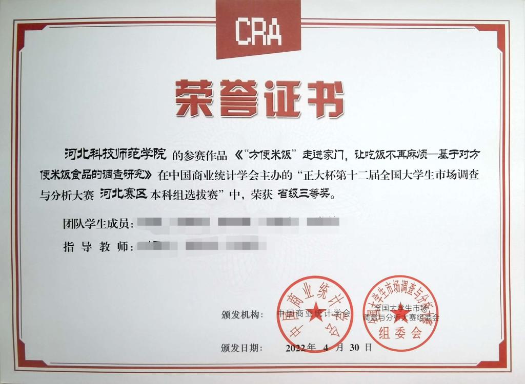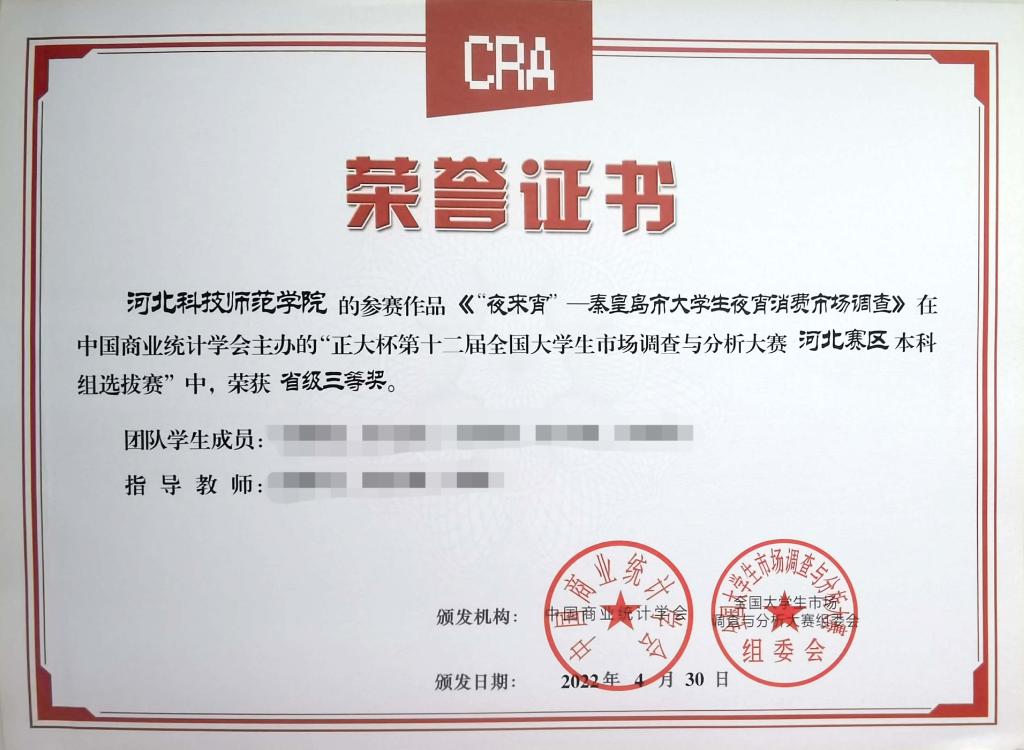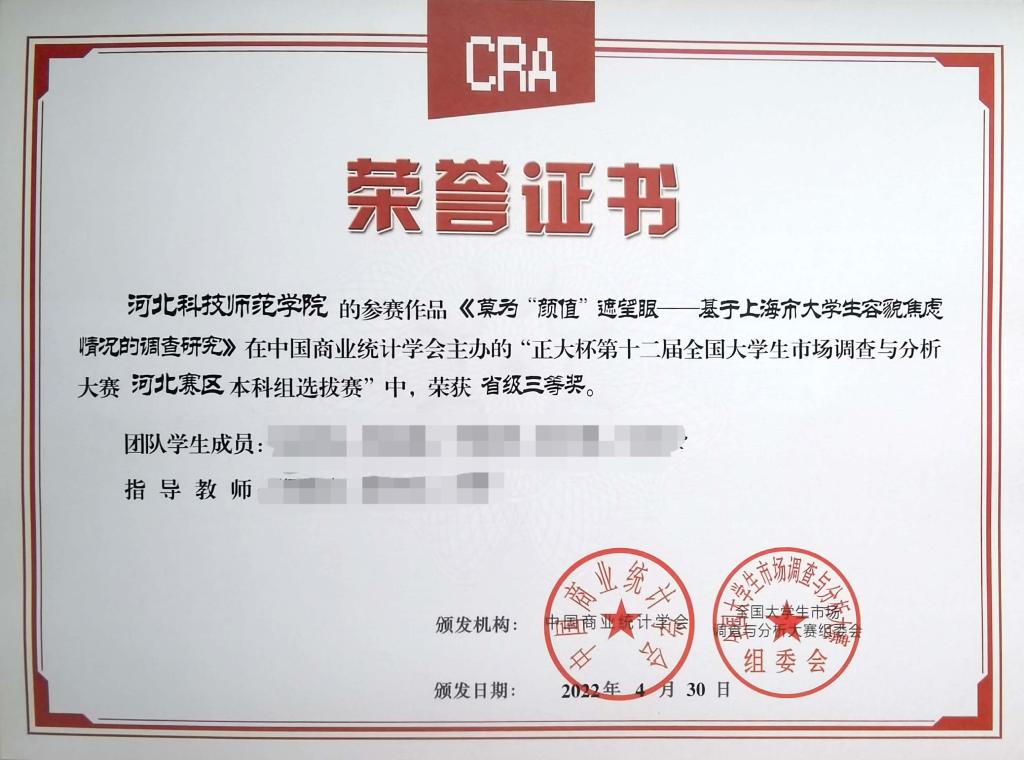 beat365亚洲版官网2019级应用统计学专业的同学们积极参与2022年度中国商业统计学会举办的“正大杯第十二届全国大学生市场调查与分析大赛河北赛区本科选拔赛”。经过同学们的认真调研与老师们的热心指导,最终共荣获三项省级三等奖。
