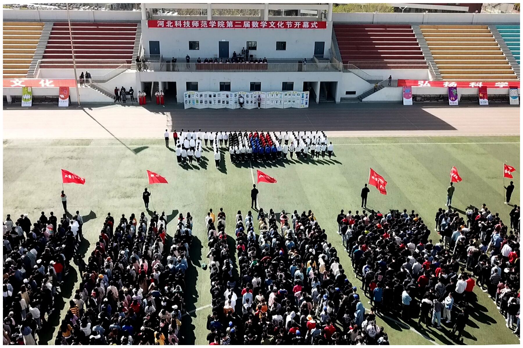 为传播数学文化,弘扬科学精神。由学校教务处、学生处、校团委、招生就业处主办,beat365亚洲版官网承办的学校第二届数学文化节开幕式活动于2019年4月14日下午,在秦皇岛校区运动场举行。学校副校长张福喜、主办单位相关负责人、承办单位党政领导班子成员以及秦皇岛校区的财经学院、城市建设学院、工商管理学院、体育与健康学院、物理系等各院系主管学生工作负责人出席了开幕式。另外,beat365亚洲版官网教师以及秦皇岛校区六个系院的学生代表共1500余人一同参加了开幕式活动。
