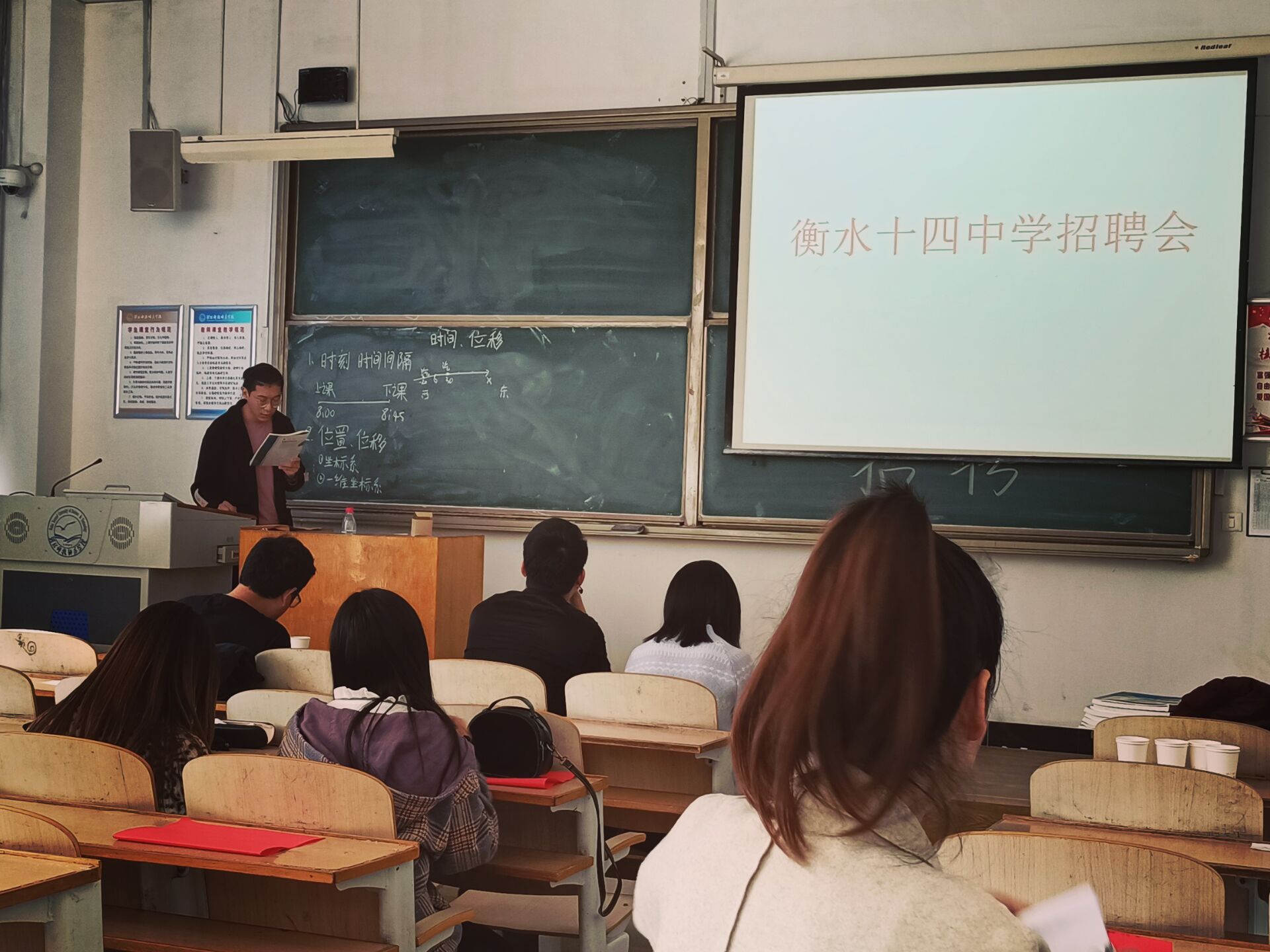 招聘会上,衡水市第十四中学的招聘负责人通过播放学校的宣传片、PPT的方式向大家详细的介绍了衡水市第十四中学的基本信息、师生源情况、毕业生上线率等,让大家更好的了解了衡水市第十四中学。衡水市第十四中学是衡水市桃城区唯一一所国办重点高中,为beat365官网毕业生提供了良好的工作平台。在招聘会现场,我院的老师对同学们如何根据自己的实际情况选择适合自己的职业岗位等方面提供了就业指导和建议。